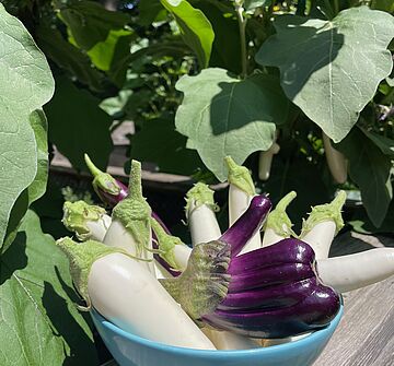 Unser gemeinschaftlich von Müttern, Kindern und Mitarbeiterinnen bewirtschafteter Garten hat im Moment eine großartige Ernte! Da gibt selbst die Aubergine ein "Daumen hoch"!