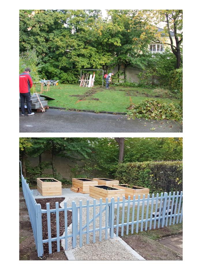 Es wurde unermüdlich geschaufelt, gesägt und Pflastersteine verlegt. Am Ende entstand eine wunderschöne grüne Oase für unsere kleinen und großen Bewohner*innen.